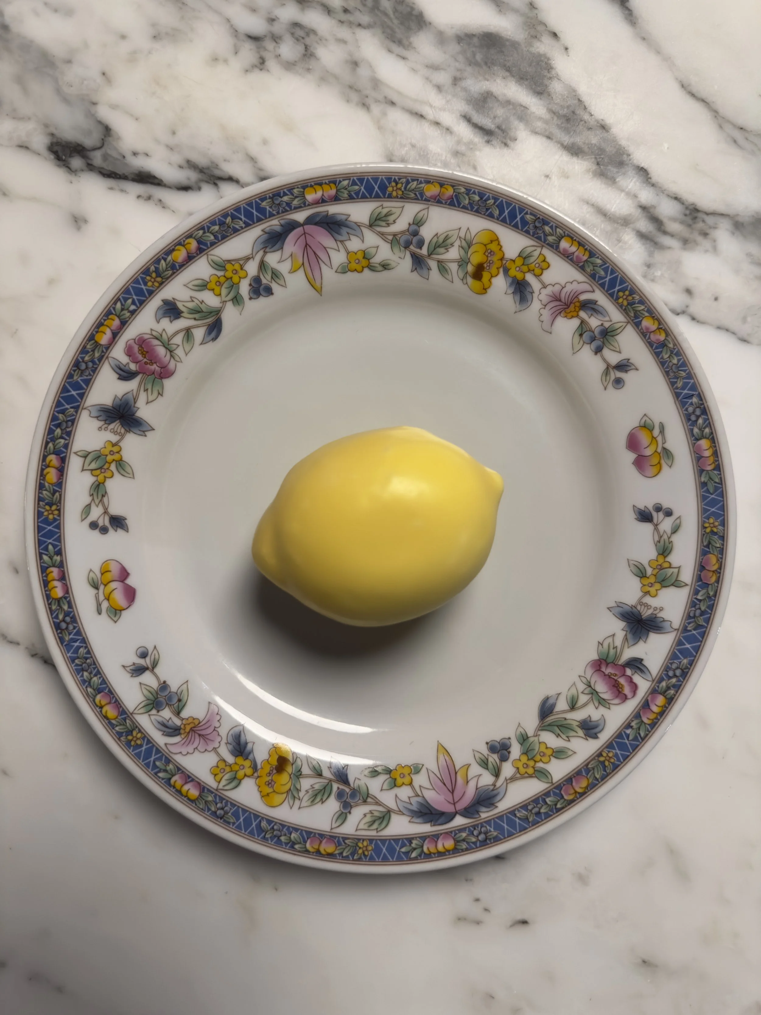 Trompe-l'œil individuel ‘citron’ : une coque délicate renfermant un cœur fondant de citron frais, enveloppé d'une mousse légère et acidulée.